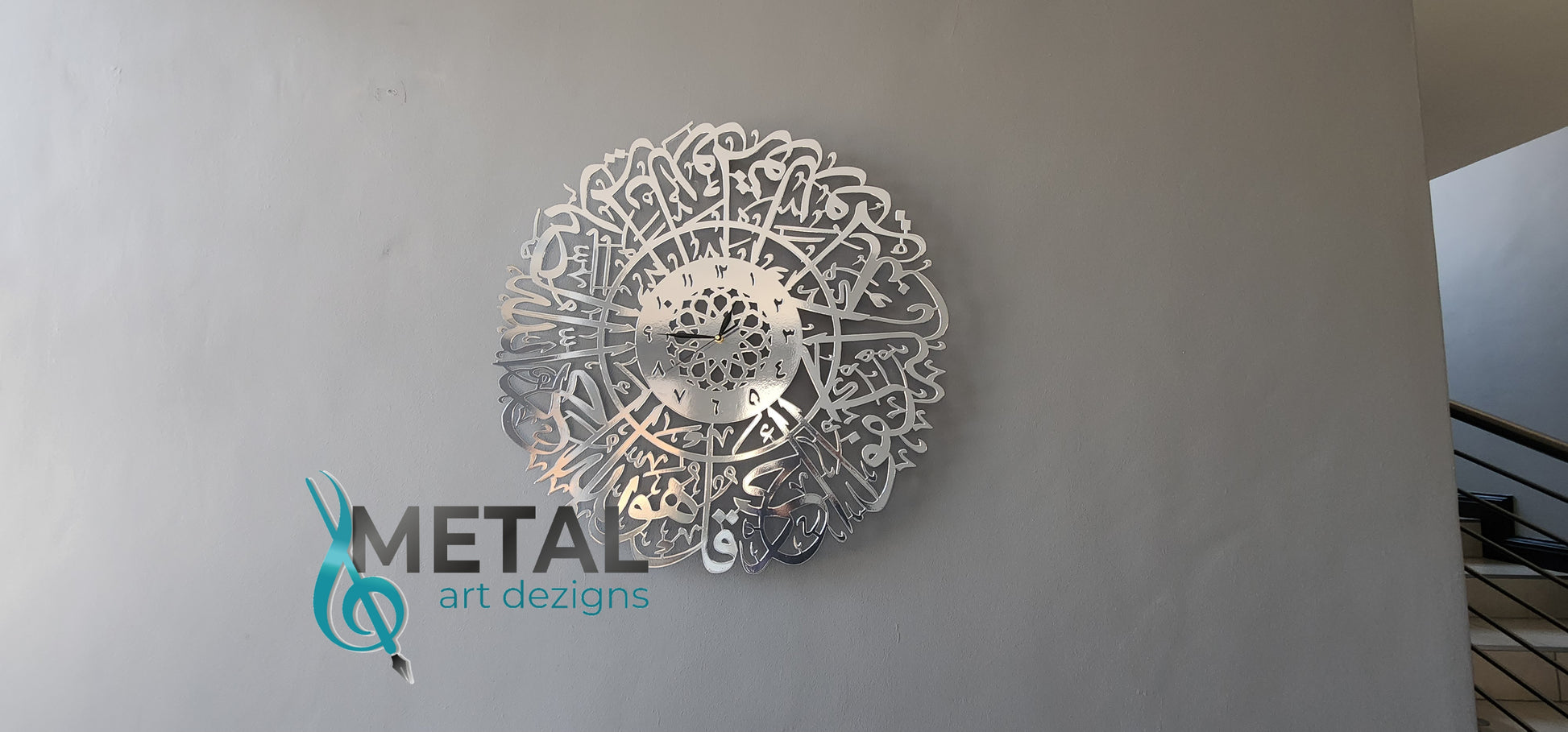 The Surah Ikhlaas Wall Clock beautifully combines function with faith, featuring the timeless words of Surah Ikhlaas crafted into a sleek, contemporary design. This stunning clock, available in chrome silver or other finishes of your choice, adds an elegant touch to any room while also being a meaningful piece of Islamic art. Perfect for living rooms, entrance halls, or as a thoughtful gift, this wall clock is ready to hang and designed to bring serenity and style to your space.